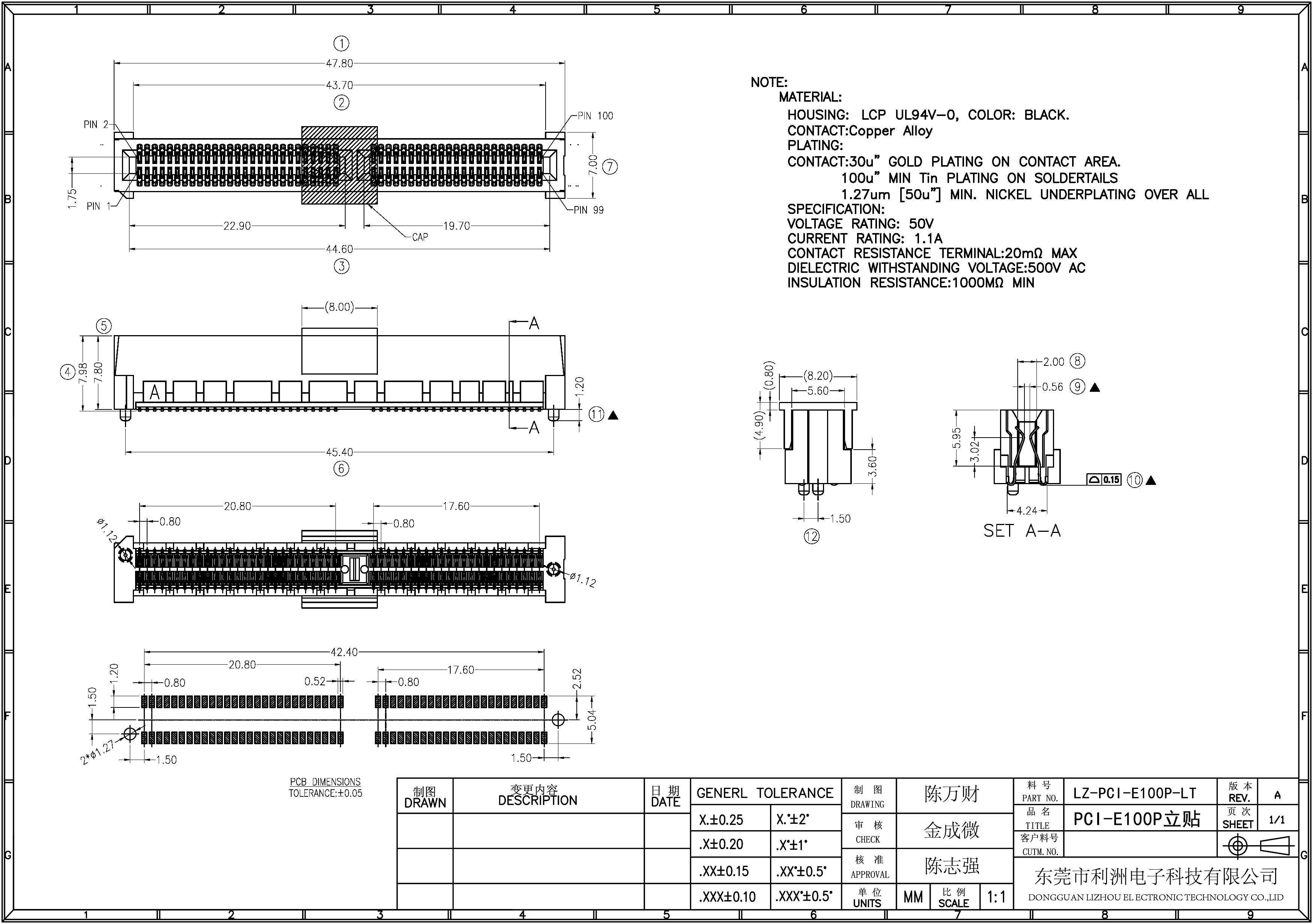 Contact: 30u"GOLD PLATING ON CONTACT AREA 100U"MIN TIN PLATING ON SOLDERTAILS 1.27UM[50U"]MIN NICKEL UNDERPLATING OVER ALL