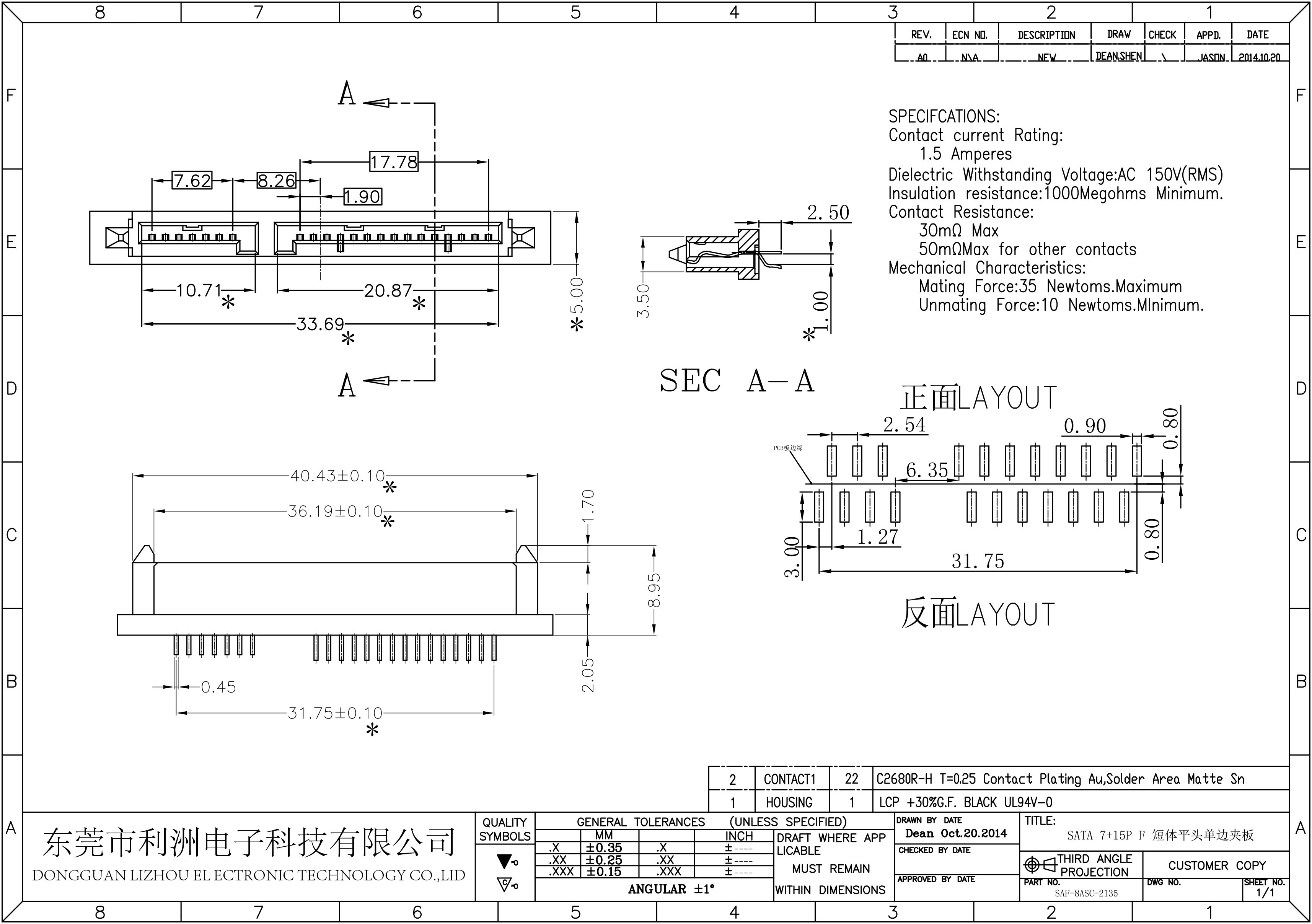 SATA7P+15P短体夹板1.6