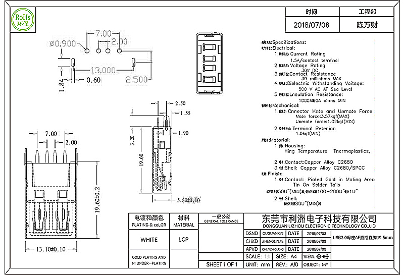 USB2.0母座AF直插直脚19.5mm