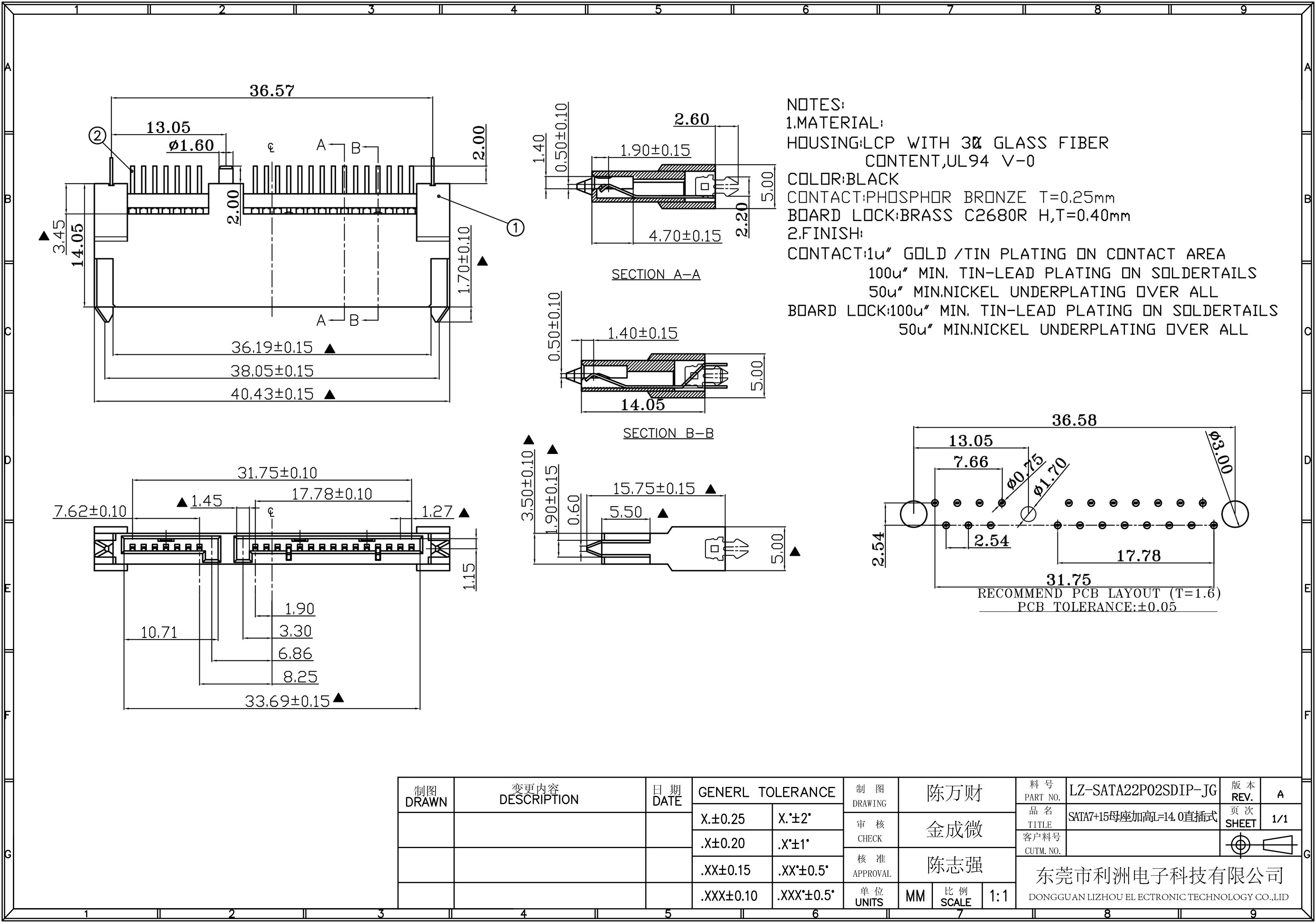 Finish Contact: 1u”gold/tin plating on contact area 100u“ min tin-lead plating on soldertails 50u”min nickel underplating over all