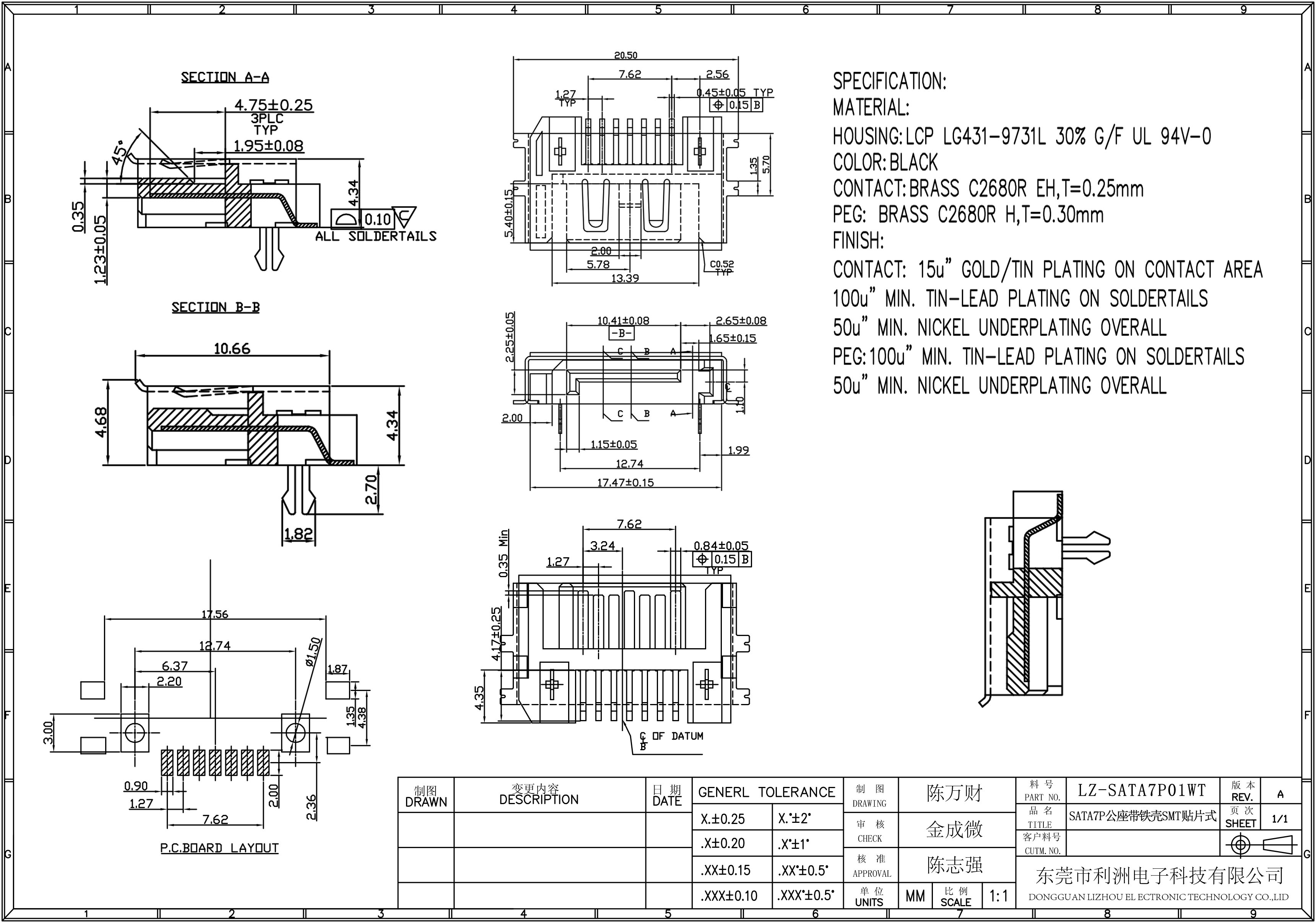 Finish Contact: 15u" gold/tin plating on contact area 100u" min tin-lead plating on soldertails 50u" min nickel underplating overall