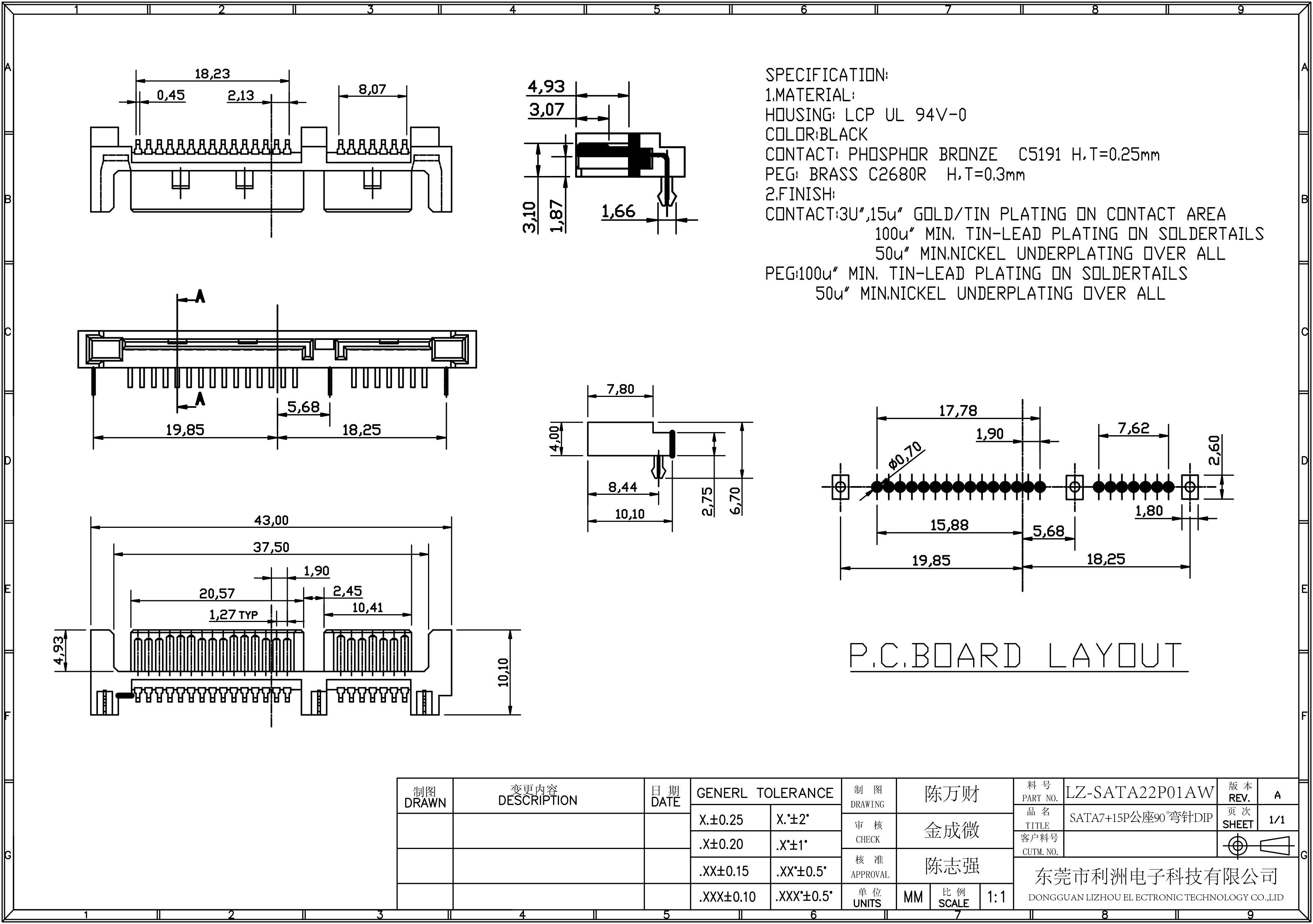 Finish Contact: 3u“-15u" gold/tin plating on contact area 100u" min tin-lead plating on soldertails 50u" min nickel underplating overall