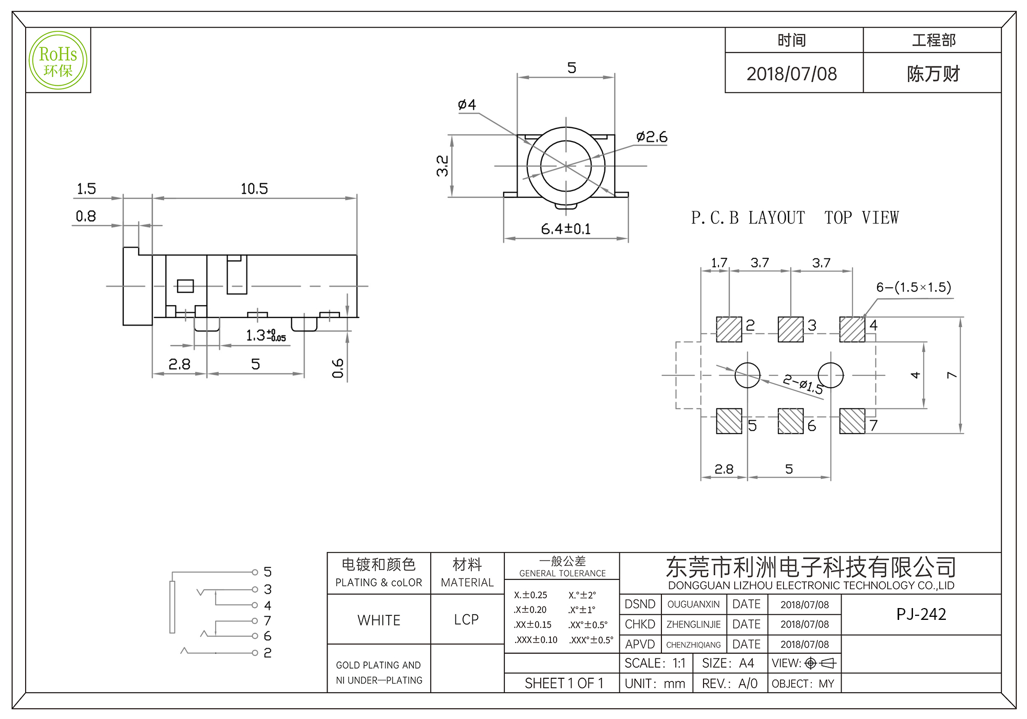 PJ-242耳机插座双柱镀金六脚贴片