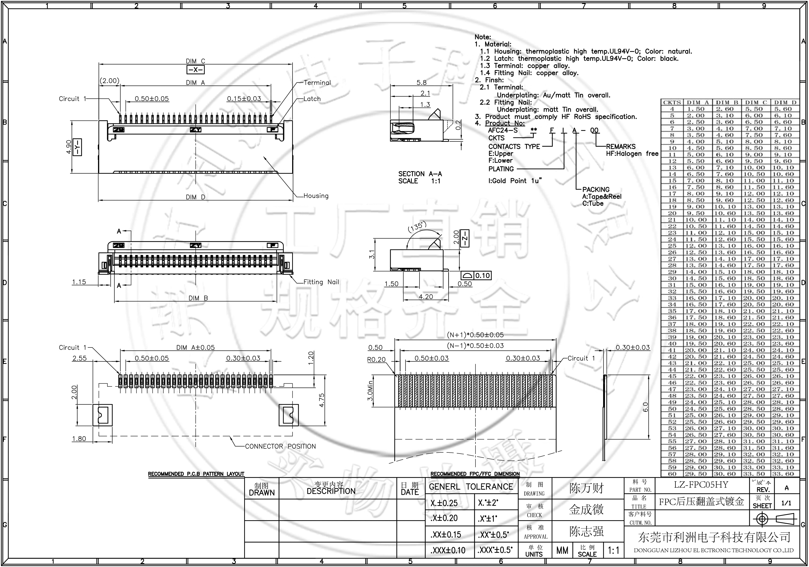 FPC0.5mm间距后压翻盖式针脚镀金