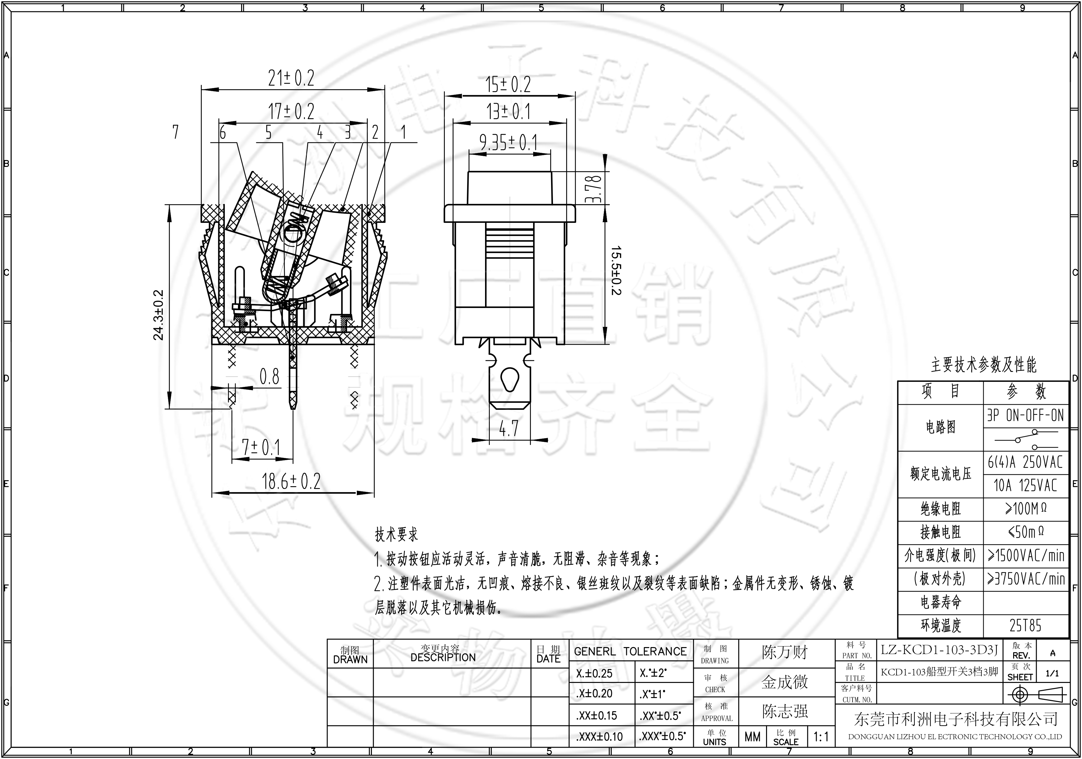 额定电流、电压: 3A 250V 6A 125V